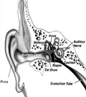 Hearing is a series of events in which sound waves in the air produce electrical signals and cause nerve impulses to be sent to the brain where they are interpreted as sound. The ear has three main parts: the outer, middle and inner ear. Sound waves enter through the outer ear and reach the middle ear where they cause the eardrum to vibrate.